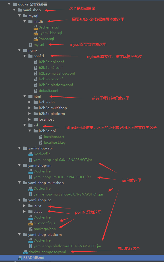 打包好3个jar包,分别放到/yami-shop-api,/yami-shop-multishop,/yami-shop-platform文件夹,(dockerfile一般不需要改动,除非你有特别需求)
